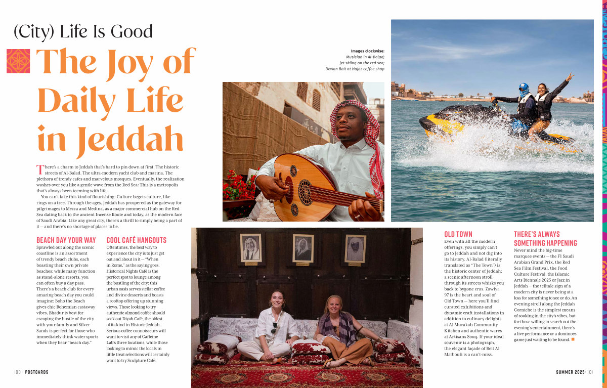 Never mind the big-time marquee events— the F1 Saudi Arabian Grand Prix, the Red Sea Film Festival, the Food Culture Festival, the Islamic Arts Biennale 2025 or Jazz in Jeddah— the telltale sign of a modern city is never being at a loss for something to see or do. An evening stroll along the Jeddah Corniche is the simplest means of soaking in the city’ s vibes, but for those willing to search out the evening’ s entertainment, there’ s a live performance or a dominoes game just waiting to be found. •