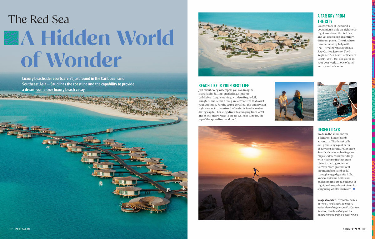 Roughly 80 % of the world’ s population is only an eight-hour flight away from the Red Sea, and yet it feels like an entirely different planet. The ultraluxe resorts certainly help with that— whether it’ s Nujuma, a Ritz-Carlton Reserve, The St. Regis Red Sea Resort or Shebara Resort, you’ ll feel like you’ re in your own world … one of total luxury and relaxation.