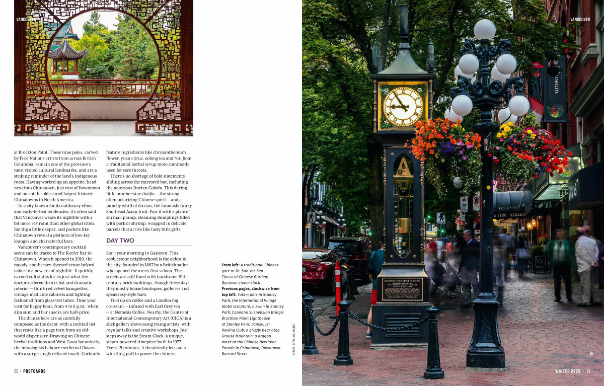 From left: A traditional Chinese gate at Dr. Sun Yat-Sen Classical Chinese Garden; Gastown steam clock Previous pages, clockwise from top left: Totem pole in Stanley Park; the International Village Globe sculpture; a swan in Stanley Park; Capilano Suspension Bridge; Brockton Point Lighthouse at Stanley Park; Vancouver Rowing Club; a grizzly bear atop Grouse Mountain; a dragon mask at the Chinese New Year Parade in Chinatown; Downtown Burrard Street |