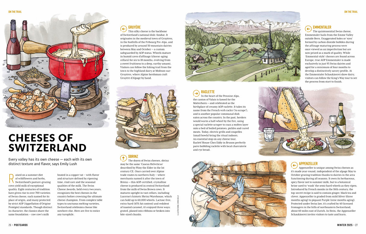 The doyen of Swiss cheeses, sbrinz may be the same‘ Caseus Helveticus’ described by Pliny the Elder in the 1st century CE. Once carried over Alpine trade routes to northern Italy— where merchants named it after the town of Brienz— this AOP-certified, crystalline cheese is produced in central Switzerland from the milk of Swiss Brown cows. It matures upright in vast cellars, including Lucerne’ s historic Sbrinz Warehouse, which can hold up to 60,000 wheels. Lactose-free, extra-hard( 45 % fat content) and redolent of toasted caramel, it’ s enjoyed three ways: grated, planed into ribbons or broken into bite-sized chunks. illustrations: emma kelly