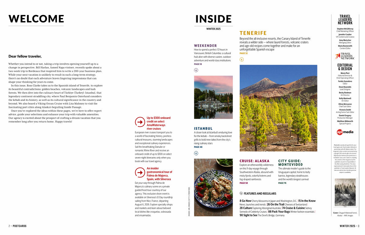 Postcards is produced quarterly for your travel agency by Travel Leaders Network in partnership with APL Media Limited. The magazine’ s entire contents are protected by copyright 2025 and all rights are reserved. Reproduction without prior permission is forbidden. Every care is taken in compiling the contents of the magazine, but the publishers assume no responsibility in the effect arising therefrom. The views expressed aren’ t necessarily those of the publisher or Travel Leaders Network. All rates are valid at time of printing and are subject to availability. images: awl images; getty; stockfood