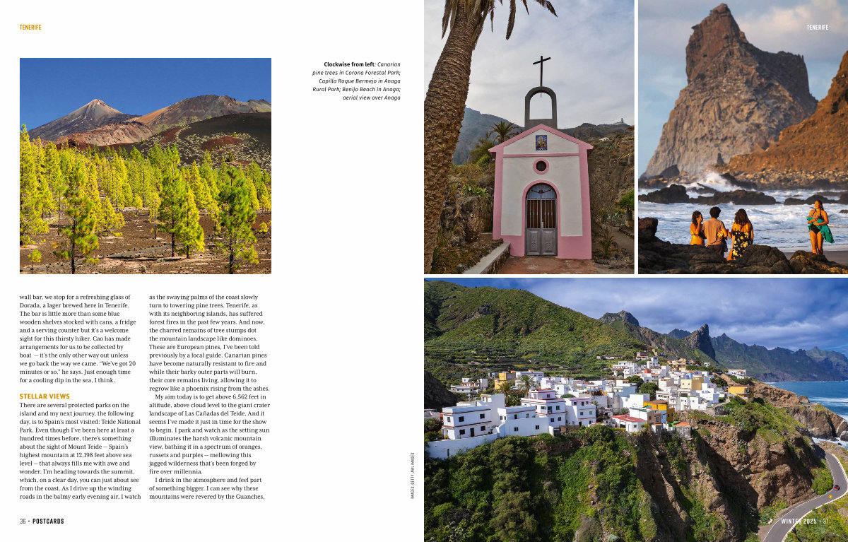Capilla Roque Bermejo in Anaga Rural Park; Benijo Beach in Anaga; aerial view over Anaga wall bar, we stop for a refreshing glass of Dorada, a lager brewed here in Tenerife. The bar is little more than some blue wooden shelves stocked with cans, a fridge and a serving counter but it’ s a welcome sight for this thirsty hiker. Cao has made arrangements for us to be collected by boat— it’ s the only other way out unless we go back the way we came.“ We’ ve got 20 minutes or so,” he says. Just enough time for a cooling dip in the sea, I think.