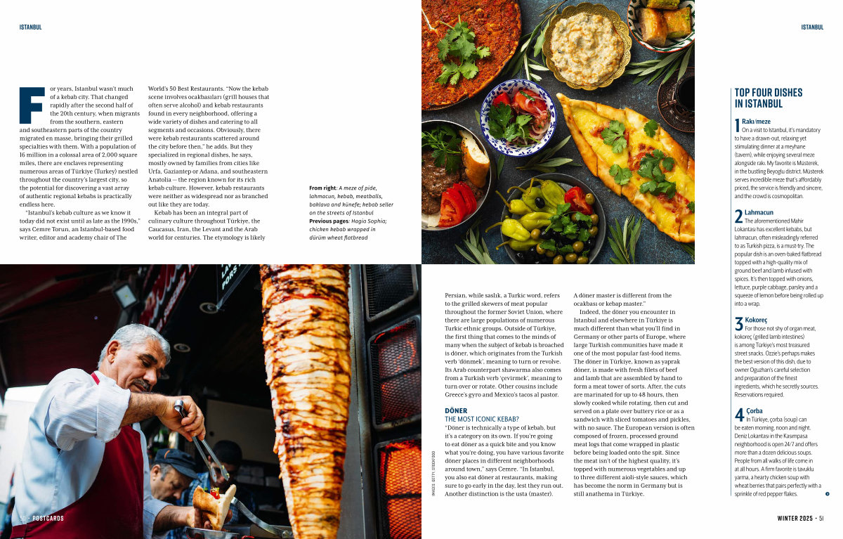 From right: A meze of pide, lahmacun, kebab, meatballs, baklava and künefe; kebab seller on the streets of Istanbul Previous pages: Hagia Sophia; chicken kebab wrapped in dürüm wheat flatbread