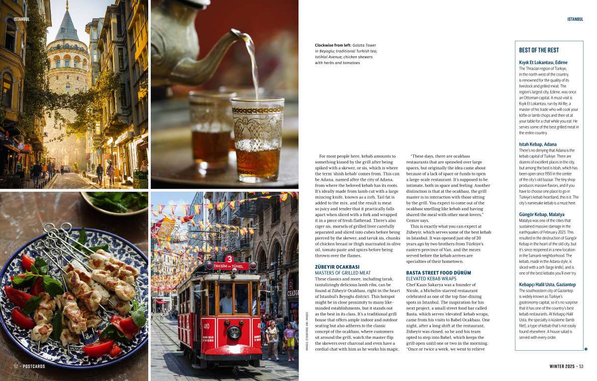 Clockwise from left: Galata Tower in Beyoglu; traditional Turkish tea; Istiklal Avenue; chicken skewers with herbs and tomatoes |