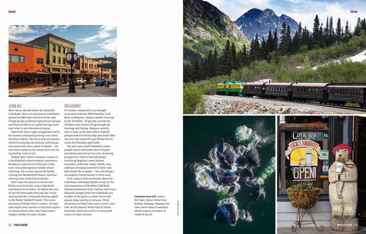 Clockwise from left: Juneau Old Town; historic White Pass Railway, Skagway; Skagway Old Town; aerial view of humpback whales lunging at surface of Frederick Sound |