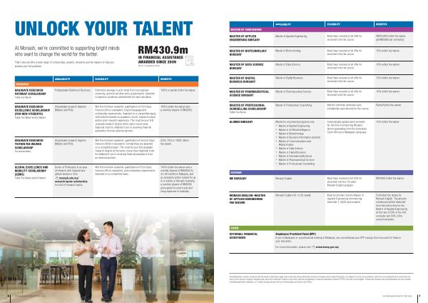 100 % tuition fee waiver and a monthly stipend of RM2850 for 33-36 months in Malaysia, and as recipients will be funded for up to 9 months in Monash Australia, a monthly stipend of RM8500 and a grant to cover travel and living expenses in Australia. |