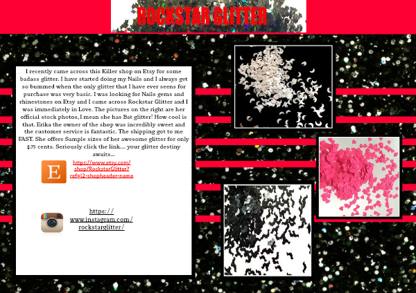 I recently came across this Killer shop on Etsy for some badass glitter. I have started doing my Nails and I always get so bummed when the only glitter that I have ever seens for purchase was very basic. I was looking for Nails gems and rhinestones on Etsy and I came across Rockstar Glitter and I was immediately in Love. The pictures on the right are her official stock photos, I mean she has Bat glitter! How cool is that. Erika the owner of the shop was incredibly sweet and the customer service is fantastic. The shipping got to me FAST. She offers Sample sizes of her awesome glitter for only $.75 cents. Seriously click the link.... your glitter destiny awaits...