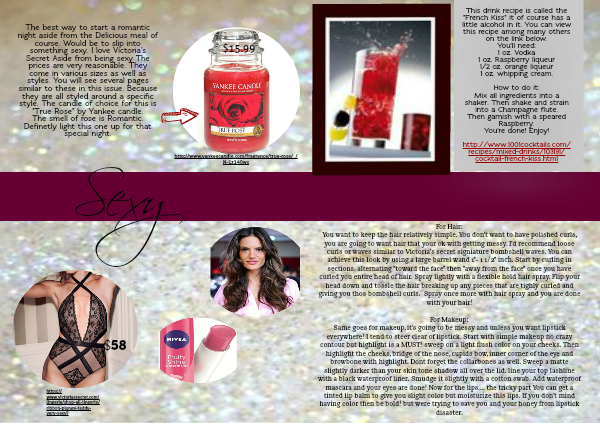 The best way to start a romantic night aside from the Delicious meal of course. Would be to slip into something sexy. I love Victoria's Secret Aside from being sexy The prices are very reasonable. They come in various sizes as well as styles. You will see several pages similar to these in this issue. Because they are all styled around a specific style. The candle of choice for this is "True Rose" by Yankee candle.