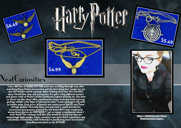 I am a BIG fan of HARRY POTTER and I was scrolling through etsy after searching Harry Potter accessories and the first thing that caught my eye was the Golden snitch earrings. After looking more into this adorable shop I found that they sell accessories for quite a few different movies and games such as Pirate's of the Caribbean, Legend of Zelda etc. You have to check out this shop! After emailing the owner back and forth I got my package within a few days of "placing an order" it was packaged very well in bubble wrap. Each piece of jewelry was under $10.00 EACH! and There all high quality! Normally when you pay such a small amount for accessories you prepare yourself for the worst BUT I was completely wrong these pieces are FANTASTIC! I get so many compliments when I wear them! The earrings look like they would be heavy but they are surprisingly light weight. I have sensitive ears and I didn't experience any sensitivity or irritation. I will Definetly be purchasing more accessories from Neatcuriosities in the FUTURE!