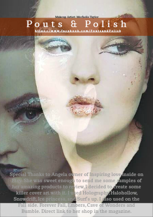 Special Thanks to Angela owner of Inspiring love inside on Etsy. She was sweet enough to send me some samples of her amazing products to review, I decided to create some killer cover art with it. I used Holography, Halohollow, Snowdrift, Ice princess, and Surf's up. I also used on the Fall side. Forever Fall, Embers, Cave of Wonders and Bumble. Direct link to her shop in the magazine.