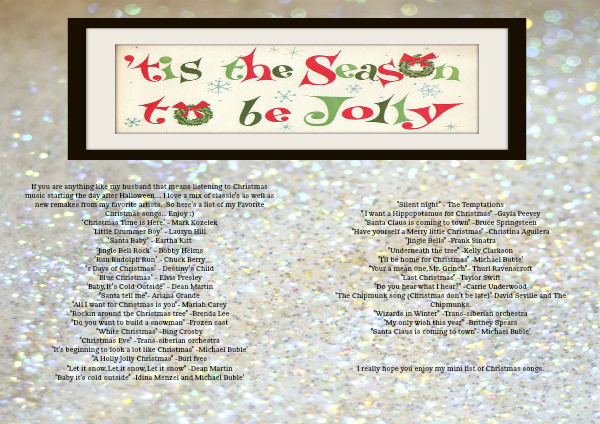 If you are anything like my husband that means listening to Christmas music starting the day after Halloween.... I love a mix of classic's as well as new remakes from my favorite artists. So here's a list of my Favorite Christmas songs... Enjoy :)