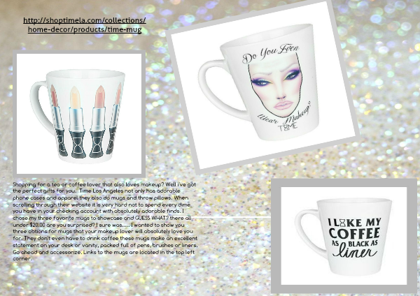 Shopping for a tea or coffee lover that also loves makeup? Well i've got the perfect gifts for you. Time Los Angeles not only has adorable phone cases and apparel they also do mugs and throw pillows. When scrolling through their website it is very hard not to spend every dime you have in your checking account with absolutely adorable finds. I chose my three favorite mugs to showcase and GUESS WHAT? there all under $20.00 are you surprised? I sure was..... I wanted to show you three obtions for mugs that your makeup lover will absolutely love you for. They don't even have to drink coffee these mugs make an excellent statement on your desk or vanity, packed full of pens, brushes or liners. Go ahead and accessorize. Links to the mugs are located in the top left corner.