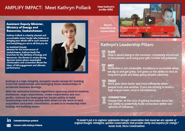 Kathryn Pollack is a keenly attuned and accountable senior leader who believes in bringing your whole self to each moment and everything you are to all that you do. As Assistant Deputy Minister for the Government of Saskatchewan, Kathryn leads five branches for the Ministry of Energy and Resources. She thrives to create strong, dynamic teams where meaningful conversation and connection weave the fabric of full engagement and ultimate performance.