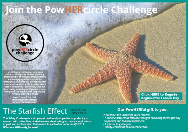 Take the PowHERcircle Challenge Our Summer 2019 PowHERcircle Challenge theme is THE STARFISH EFFECT. Starting after Labour Day. Our PowHERful Gift to YOU! This 7-Day Challenge is a simple yet profoundly impactful opportunity to connect with other like-minded leaders also looking to create a world-class impact and explore what that means to each of us - now - in Q3 2019. What are you ready for next?