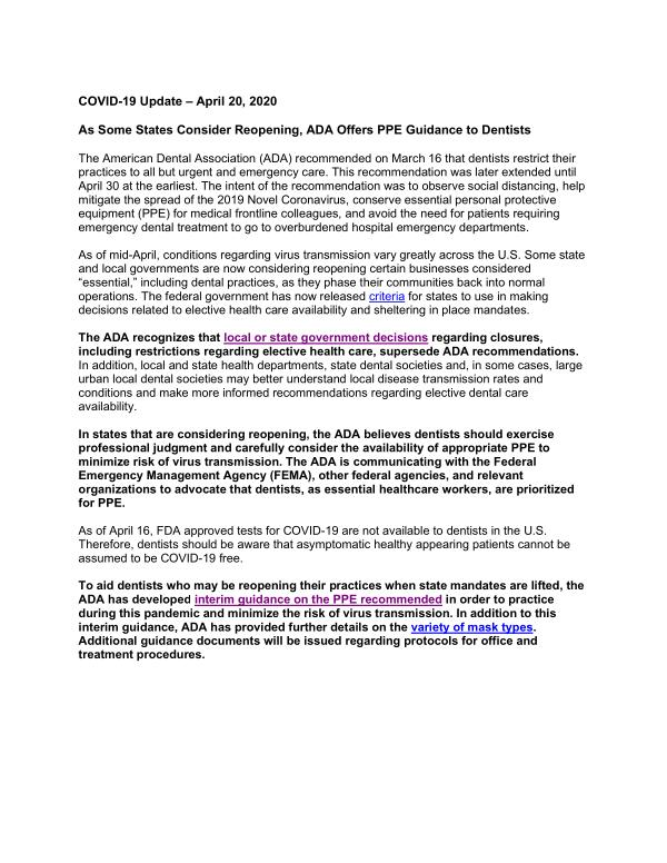 COVID-19 Update – April 20 , 2020 As Some States Consider Reopening , ADA Offers PPE Guidance to Dentists