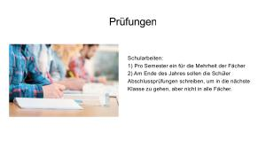 Schularbeiten : 1 ) Pro Semester ein für die Mehrheit der Fächer 2 ) Am Ende des Jahres sollen die Schüler Abschlussprüfungen schreiben , um in die nächste Klasse zu gehen , aber nicht in alle Fächer .