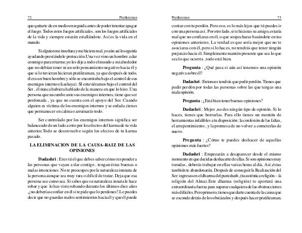 Dadashri: Empezarán a desaparecer desde el mismo momento en que decidas deshacerte de ellas. Si son opiniones muy tozudas, deberás trabajar en ellas varias horas al día. Así, éstas también te abandonarán. Después de conseguir la Realización del Ser ingresas en el dharma del purushath,( tu auténtica religión – la religión del Alma). Este dharma( religión) te aportará una extraordinaria fuerza para superar cualquiera de las obstrucciones más difíciles. Pero primero, tienes que darte cuenta de la causa que se esconde detrás de los obstáculos y después hacer pratikraman.