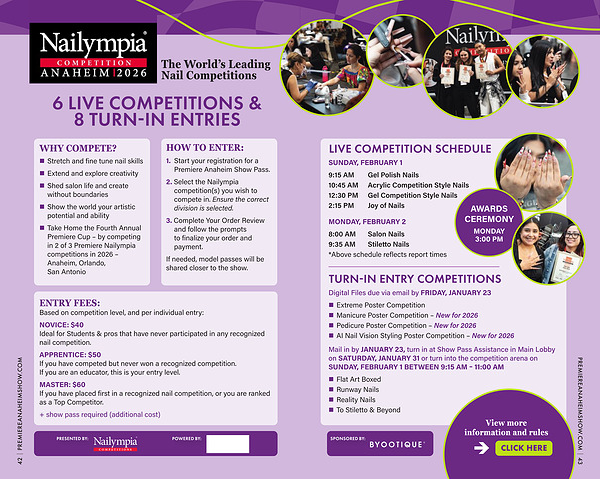 • Take Home the Fourth Annual Premiere Cup – by competing in 2 of 3 Premiere Nailympia competitions in 2026 – Anaheim, Orlando, San Antonio