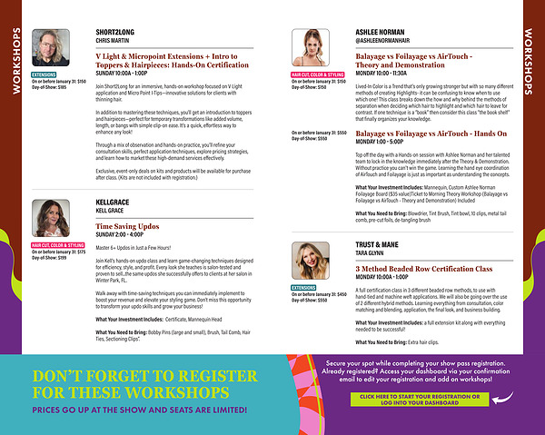Secure your spot while completing your show pass registration. Already registered? Access your dashboard via your confirmation email to edit your registration and add on workshops!
