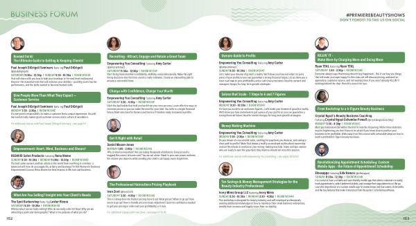 Crystal Ngozi ’ s Beauty Business Coaching featuring Crystal Ngozi Ochemba-Powell (@ crystalngozicoaching ) MONDAY 3:30 - 4:30p I ROOM W206C Most spa businesses fail within the first 18 months of opening . While these statistics may be frightening , you don ’ t have to be afraid if you know how to position your business to be profitable . Walk away from this course with actionable steps on how to build a profitable 6-figure beauty business .