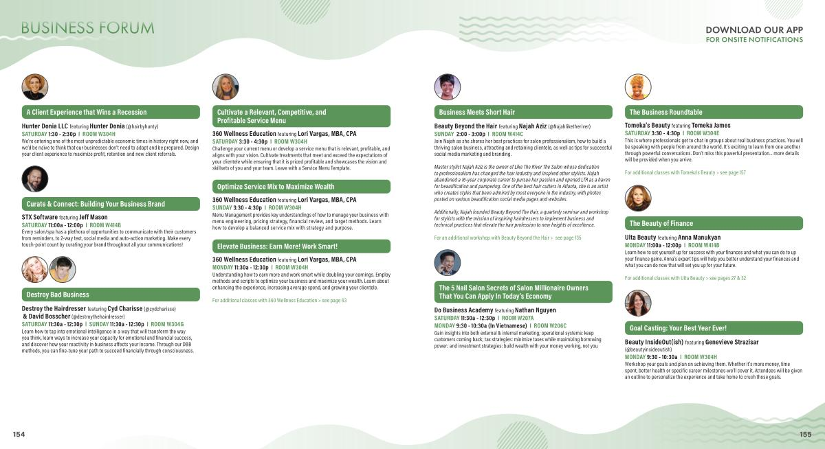 360 Wellness Education featuring Lori Vargas , MBA , CPA MONDAY 11:30a - 12:30p I ROOM W304H Understanding how to earn more and work smart while doubling your earnings . Employ methods and scripts to optimize your business and maximize your wealth . Learn about enhancing the experience , increasing average spend , and growing your clientele .