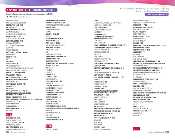 MESOGOLD BEAUTY SUPPLY MIAMON LLC DBA LISS EXPERT USA � MILBON USA � - P 34 MINDFUL MINERALS - P 104 , 105 MIRACLEBLEND HAIR CARE MIZANI - P 28 , 30 , 58 MODIFI PRODUCTS LLC MONAE EVERETT - P 61 , 120 MOROYA BEAUTY � MPF BRUSH NAILS � MRNAILZ - P 80 NAIL ALLIANCE - GELISH / MORGAN TAYLOR - P 77 , 125 NAIL DAD STUDIO � - P 125 NAIL FACTORY CO � - P 82 NAILZ BY DEV - P 79 NAK HAIR � NANO LAMINATION NANO SHAPE OF BEAUTY NANO-STAMP 360 / CRYO-LEAN 360 - P 106 NATIONAL TRICHOLOGY TRAINING INSTITUTE - P 68 NATIVE SKINCARE SHOP � NATURAVERDEPRO DEPILATORY WAXING - P 96 NATURE PURE CLINICAL SKIN CARE - P 106 NATURE ’ S OWN PRIVATE LABEL COSMETICS � NDS BEAUTY PRO � NEOEYRA NAIL NICCK TOWNSEND ENTERPRISES - P 108 NICEHAIR VIETNAM CO ., LTD NIKKI LE CONSULTANCY - P 147 NINA LASH - P 110 NIP & CLIP INSTANT FACELIFT � NISHMAN NISH COSMETICS INC NORTH AMERICAN SCHOOL OF PODOLOGY - P 78 , 124 NORVELL SUNLESS - P 96 NOTPOLISH NAIL DESIGN , INC . - P 86 NOUVEAU CONTOUR - P 113 NOVALASH EYELASH EXTENSIONS