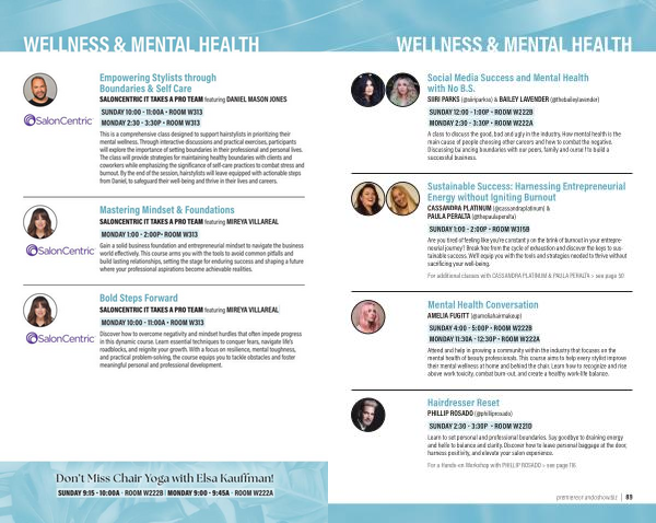 Attend and help in growing a community within the industry that focuses on the mental health of beauty professionals . This course aims to help every stylist improve their mental wellness at home and behind the chair . Learn how to recognize and rise above work toxicity , combat burn-out , and create a healthy work-life balance .