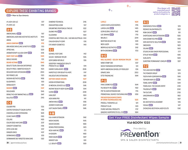 RAWSKINCEUTICALS 1218 REDAVID SALON PRODUCTS 1522 REMI CACHET 1511 SHORT2LONG HAIR EXTENSIONS 1505 SKIN COSMETICS PRO 1238 SKYA AESTHETIC SOLUTION 1223 SMOCKERS 1820 SOLANO 1843 STUDIO 24 DBA DINOR PROFESSIONAL 1717 STYLIST WEAR 1846 SUNLIGHTS 1609 SUNSTONE PERMANANET JEWELRY 1207
