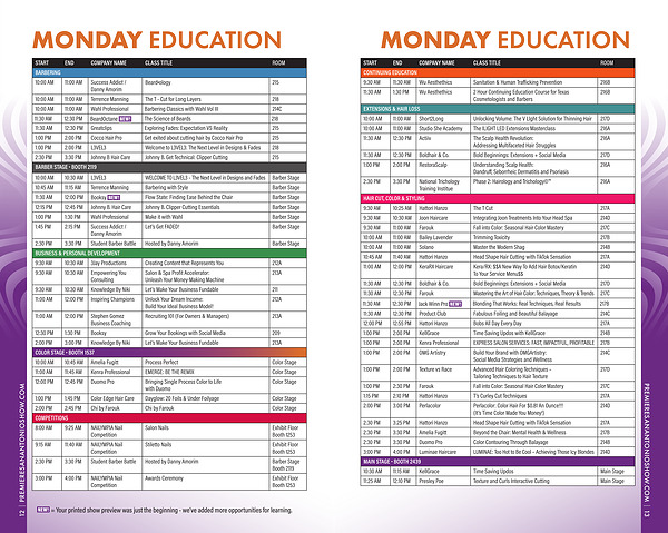10:00 AM 11:00 AM Terrence Manning The T- Cut for Long Layers 218 10:00 AM 11:00 AM Wahl Professional Barbering Classics with Wahl Vol III 214C 11:30 AM 12:30 PM BeardOctane The Science of Beards 218 11:30 AM 12:30 PM Greatclips Exploring Fades: Expectation VS Reality 215 1:00 PM 2:00 PM Cocco Hair Pro Get exited about cutting hair by Cocco Hair Pro 215 1:00 PM 2:00 PM L3VEL3 Welcome to L3VEL3: The Next Level in Designs & Fades 218 2:30 PM 3:30 PM Johnny B Hair Care Johnny B. Get Technical: Clipper Cutting 215 BARBER STAGE • BOOTH 2119 10:00 AM 10:30 AM L3VEL3 WELCOME TO L3VEL3 – The Next Level in Designs and Fades Barber Stage 10:45 AM 11:15 AM Terrence Manning Barbering with Style Barber Stage 11:30 AM 12:00 PM Booksy Flow State: Finding Ease Behind the Chair Barber Stage 12:15 PM 12:45 PM Johnny B. Hair Care Johnny B. Clipper Cutting Essentials Barber Stage 1:00 PM 1:30 PM Wahl Professional Make it with Wahl Barber Stage