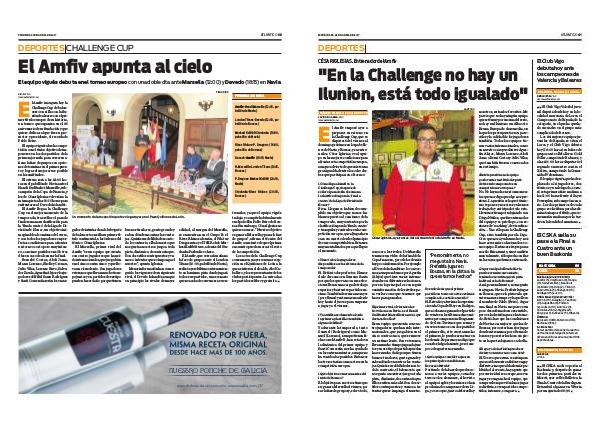 trenador, ya que el equipo vigués trabaja y compite habitualmente en el pabellón Pablo Beiro de Bouzas. Sin embargo, César Iglesias no quiere excusas. " Nuestro objetivo es ganar al Marsella y pasar la fase de grupos ", afirma el técnico del Amfiv, consciente de que el primer encuentro puede marcar el resto de la competición.