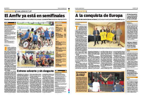 El Amfiv se clasificó ayer para las semifinales de la Challenge Cup, torneo que disputa como anfitrión, al ganar con mucha autoridad los dos primeros partidos de la fase de grupos ante el Handi Sud Marsella francés y el Devedo holandés, respectivamente. El equipo vigués se juega hoy( 10:00, Navia) el primer puesto del grupo contra el London Titans, que también se impuso en sus dos encuentros, y a las 18:15 jugará su semifinal, que será en el pabellón de Navia si termina en la primera plaza, o en el pabellón Pablo Beiro de Bouzas si se clasifica como segundo.