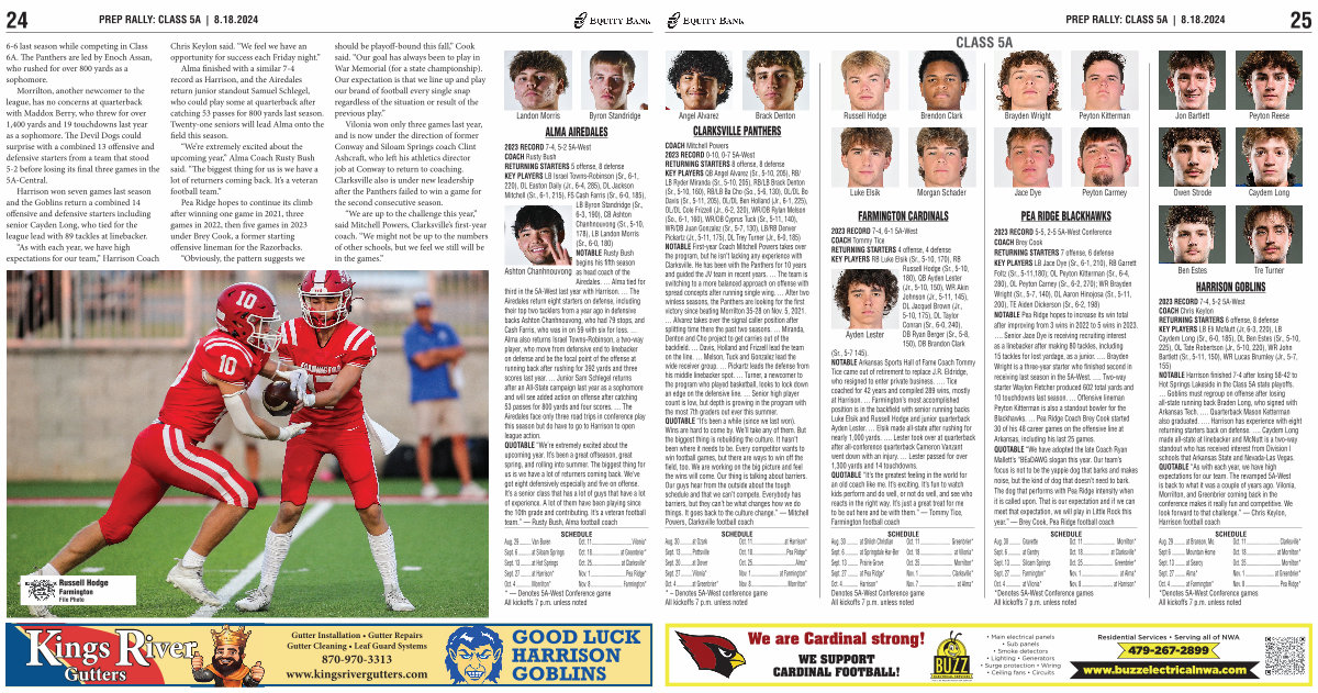 Ashton Chanhnouvong begins his fifth season as head coach of the Airedales. … Alma tied for third in the 5A-West last year with Harrison. … The Airedales return eight starters on defense, including their top two tacklers from a year ago in defensive backs Ashton Chanhnouvong, who had 79 stops, and Cash Farris, who was in on 59 with six for loss. … Alma also returns Israel Towns-Robinson, a two-way player, who move from defensive end to linebacker on defense and be the focal point of the offense at running back after rushing for 392 yards and three scores last year. … Junior Sam Schlegel returns after an All-State campaign last year as a sophomore and will see added action on offense after catching 53 passes for 800 yards and four scores. … The Airedales face only three road trips in conference play this season but do have to go to Harrison to open league action. QUOTABLE“ We’ re extremely excited about the upcoming year. It’ s been a great offseason, great spring, and rolling into summer. The biggest thing for us is we have a lot of returners coming back. We’ ve got eight defensively especially and five on offense. It’ s a senior class that has a lot of guys that have a lot of experience. A lot of them have been playing since the 10th grade and contributing. It’ s a veteran football team.”— Rusty Bush, Alma football coach