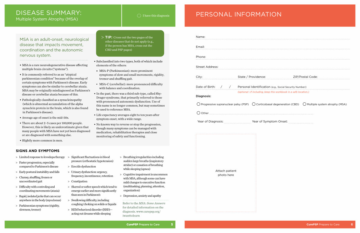 Refer to the MSA: Some Answers for detailed information on the diagnosis. www. curepsp. org / iwanttolearn