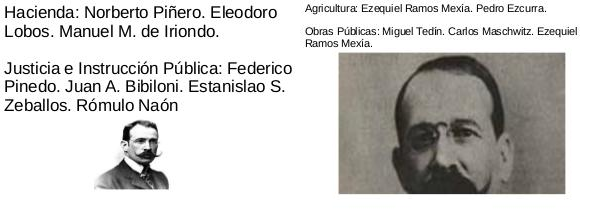 Agricultura: Ezequiel Ramos Mexía. Pedro Ezcurra. Obras Públicas: Miguel Tedín. Carlos Maschwitz. Ezequiel Ramos Mexía.