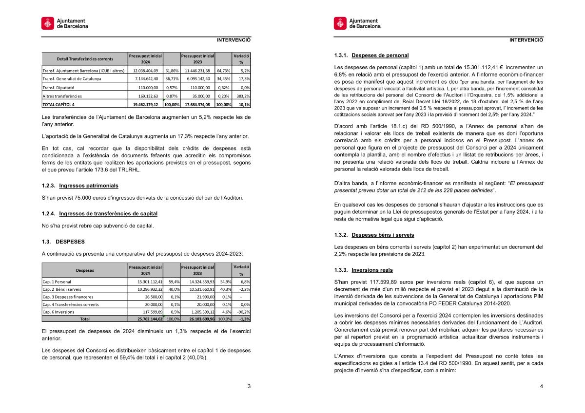 Les despeses de personal ( capítol 1 ) amb un total de 15.301.112,41 € incrementen un 6,8 % en relació amb el pressupost de l ’ exercici anterior . A l ’ informe econòmic-financer es posa de manifest que aquest increment es deu “ per una banda , per l ’ augment de les despeses de personal vinculat a l ’ activitat artística . I , per altra banda , per l ’ increment consolidat de les retribucions del personal del Consorci de l ’ Auditori i l ’ Orquestra , del 1,5 % addicional a l ’ any 2022 en compliment del Reial Decret Llei 18 / 2022 , de 18 d ’ octubre , del 2,5 % de l ’ any 2023 que va suposar un increment del 0,5 % respecte al pressupost aprovat , l ’ increment de les cotitzacions socials aprovat per l ’ any 2023 i la previsió d ’ increment del 2,5 % per l ’ any 2024 .”