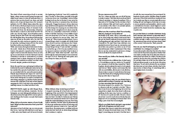 In your opinion, why do you think that a substantial number of women are deciding to stop removing their body hair? For many women, it’ s a protest. It’ s a“ fuck you to whoever told me I needed to do this”. This is what it was for me in the beginning, but now it has merged into a simple choice that doesn’ t really mean anything. In the same way, I put on a necklace or if I choose not to paint my nails. It’ s just a choice about how I care for my body and looks that also happens to be an amazing movement that I love being a part of and that is meaningful.