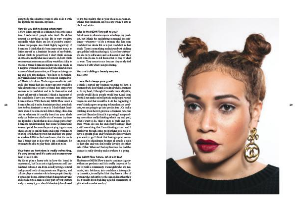 How do you define being a feminist? I 100 % define myself as a feminist, but at the same time I understand people who don’ t. To define yourself as anything in this life is very weighty, especially when there are lot of positive connotations but people also think highly negatively of feminism. I think that it’ s been important to me to define myself as a feminist because of my beliefs. I don’ t think it’ s prescribed, I don’ t think women want to do exactly what men want to do, but I think women want autonomy and they want the ability to choose. I think feminism inspires men as much as it inspires women because society shouldn’ t dictate someone’ s family narrative, or if boys are into gaming and girls into fashion.“ You have to be technically minded and you have to be more design driven”. That’ s ridiculous. That’ s my personal take on it and I also think that also in my career it would be ridiculous for me to have a brand that empowers women to be confident and to be themselves and to not call myself a feminist. I think a huge part of the confidence I have as a woman comes from my feminist ideals. With that said, MDM Flow is not a feminist brand, it isn’ t a feminist product, you don’ t have to be a feminist to wear it. I don’ t think feminism should be some retail driven thing, like a fan club or whatever, it is really based on your ideals and your believes and all sorts of woman buy into my lipsticks. I think that is also a huge part of my feminism, understanding that some woman want to wear lipstick because they are trying to get a man whose going to enable them and some women are wearing it with their power suit and they are going to absolute kill it in the boardroom, that for me is fine. I think that is also why I am a feminist: for women to be able to play these different roles.