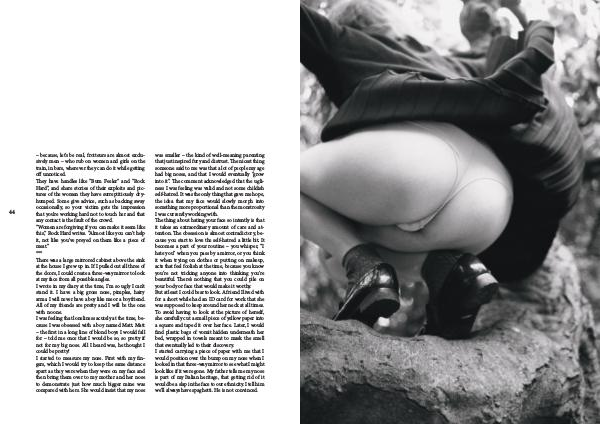 – because, let’ s be real, frotteurs are almost exclusively men – who rub on women and girls on the train, in bars, wherever they can do it while getting off unnoticed. They have handles like“ Bum Feeler” and“ Rock Hard”, and share stories of their exploits and pictures of the women they have surreptitiously dryhumped. Some give advice, such as backing away occasionally, so your victim gets the impression that you’ re working hard not to touch her and that any contact is the fault of the crowd.“ Women are forgiving if you can make it seem like this,” Rock Hard writes.“ Almost like you can’ t help it, not like you’ ve preyed on them like a piece of meat.” *** There was a large mirrored cabinet above the sink at the house I grew up in. If I pulled out all three of the doors, I could create a three-way mirror to look at my face from all possible angles. I wrote in my diary at the time, I’ m so ugly I can’ t stand it. I have a big gross nose, pimples, hairy arms. I will never have a boy like me or a boyfriend. All of my friends are pretty and I will be the one with no one. I was feeling that loneliness acutely at the time, because I was obsessed with a boy named Matt. Matt – the first in a long line of blond boys I would fall for – told me once that I would be so, so pretty if not for my big nose. All I heard was, he thought I could be pretty! I started to measure my nose. First with my fingers, which I would try to keep the same distance apart as they were when they were on my face and then bring them over to my mother and her nose to demonstrate just how much bigger mine was compared with hers. She would insist that my nose was smaller – the kind of well-meaning parenting that just inspired fury and distrust. The nicest thing someone said to me was that a lot of people my age had big noses, and that I would eventually“ grow into it”. The comment acknowledged that the ugliness I was feeling was valid and not some childish self-hatred. It was the only thing that gave me hope, the idea that my face would slowly morph into something more proportional than the monstrosity I was currently working with. The thing about hating your face so intently is that it takes an extraordinary amount of care and attention. The obsession is almost contradictory, because you start to love the self-hatred a little bit. It becomes a part of your routine – you whisper,“ I hate you” when you pass by a mirror, or you think it when trying on clothes or putting on makeup, acts that feel foolish at the time, because you know you’ re not tricking anyone into thinking you’ re beautiful. There’ s nothing that you could pile on your body or face that would make it worthy. But at least I could bear to look. A friend I lived with for a short while had an ID card for work that she was supposed to keep around her neck at all times. To avoid having to look at the picture of herself, she carefully cut a small piece of yellow paper into a square and taped it over her face. Later, I would find plastic bags of vomit hidden underneath her bed, wrapped in towels meant to mask the smell that eventually led to their discovery. I started carrying a piece of paper with me that I would position over the bump on my nose when I looked in that three-way mirror to see what I might look like if it were gone. My father tells me my nose is part of my Italian heritage, that getting rid of it would be a slap in the face to our ethnicity. I tell him we’ ll always have spaghetti. He is not convinced.