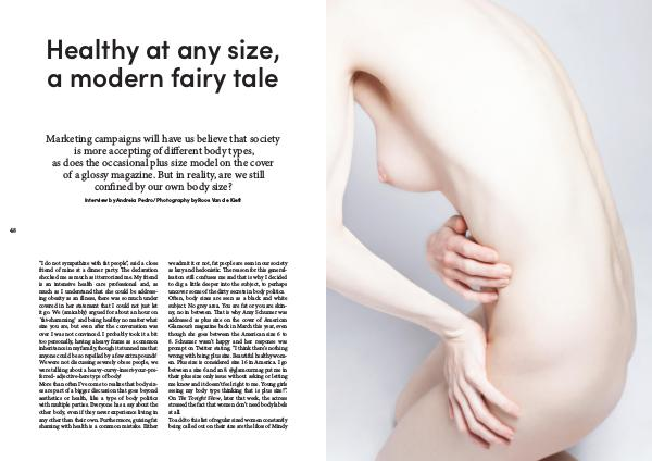 “ I do not sympathize with fat people”, said a close friend of mine at a dinner party. The declaration shocked me as much as it terrorized me. My friend is an intensive health care professional and, as much as I understand that she could be addressing obesity as an illness, there was so much under covered in her statement that I could not just let it go. We( amicably) argued for about an hour on ´ fat-shamming` and being healthy no matter what size you are, but even after the conversation was over I was not convinced. I probably took it a bit too personally, having a heavy frame as a common inheritance in my family, though it stunned me that anyone could be so repelled by a few extra pounds! We were not discussing severely obese people, we were talking about a heavy-curvy-insert-your-preferred- adjective-here type of body! More than often I’ ve come to realize that body sizes are part of a bigger discussion that goes beyond aesthetics or health, like a type of body politics with multiple parties. Everyone has a say about the other body, even if they never experience living in any other than their own. Furthermore, guising fat shaming with health is a common mistake. Either we admit it or not, fat people are seen in our society as lazy and hedonistic. The reason for this generalisation still confuses me and that is why I decided to dig a little deeper into the subject, to perhaps uncover some of the dirty secrets in body politics. Often, body sizes are seen as a black and white subject. No grey area. You are fat or you are skinny, no in between. That is why Amy Schumer was addressed as plus size on the cover of American Glamour’ s magazine back in March this year, even though she goes between the American size 6 to 8. Schumer wasn’ t happy and her response was prompt on Twitter stating,“ I think there’ s nothing wrong with being plus size. Beautiful healthy women. Plus size is considered size 16 in America. I go between a size 6 and an 8. @ glamourmag put me in their plus size only issue without asking or letting me know and it doesn’ t feel right to me. Young girls seeing my body type thinking that is plus size?”. On The Tonight Show, later that week, the actress stressed the fact that women don’ t need body labels at all. To add to this list of regular sized women constantly being called out on their size are the likes of Mindy