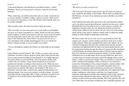 Lady Catherine seemed resigned. " Mrs. Collins, you must send a servant with them. You know I always speak my mind, and I cannot bear the idea of two young women travelling post by themselves. It is highly improper. You must contrive to send somebody. I have the greatest dislike in the world to that sort of thing. Young women should always be properly guarded and attended, according to their situation in life. When my niece Georgiana went to Ramsgate last summer, I made a point of her having two men-servants go with her. Miss Darcy, the daughter of Mr. Darcy, of Pemberley, and Lady Anne, could not have appeared with propriety in a different manner. I am excessively attentive to all those things. You must send John with the young ladies, Mrs. Collins. I am glad it occurred to me to mention it; for it would really be discreditable to you to let them go alone."