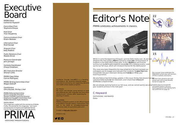 About PRIMA PRIMA is published quarterly as the official magazine of Excellence Through Classics . Submissions may be sent to the Editor at prima @ etclassics . org . Submission does not guarantee publication .