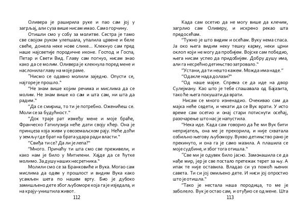 Отишли смо у собу за молитве . Сестра је тамо све својом руком улепшала , упалила црвене и беле свеће , донела неке нове слике ... Клекнуо сам пред наше најсветије породичне иконе . Господ и Госпа , Петар и Свети Вид . Главу сам погнуо , нисам знао како да се молим . Оливера је клекнула поред мене и наслонила главу на моје раме .
