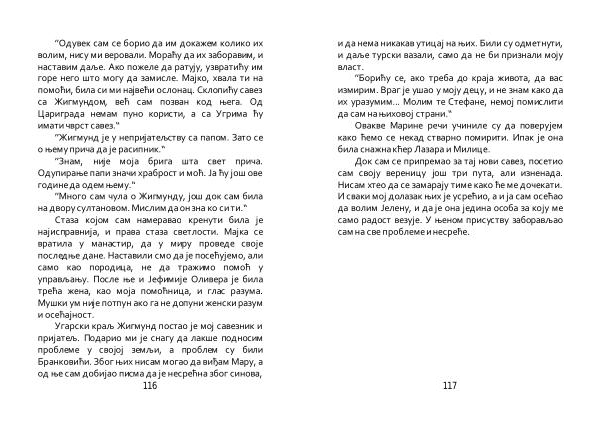 Угарски краљ Жигмунд постао је мој савезник и пријатељ . Подарио ми је снагу да лакше подносим проблеме у својој земљи , а проблем су били Бранковићи . Због њих нисам могао да виђам Мару , а од ње сам добијао писма да је несрећна због синова , 116