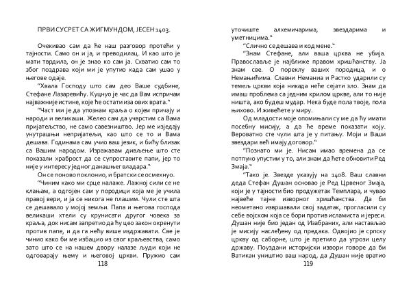’’ Тако је . Звезде указују на 1408 . Ваш славни деда Стефан Душан основао је Ред Црвеног Змаја , који је у тајности био продужетак Темплара , и чувао највеће тајне изворног хришћанства . Да би неометано извршавали свој задатак , прогласили су себе војском која се бори против исламиста и јереси . Душан није био један од Изабраних , али настављао је мисију наслеђену од предака . Одвојио је српску цркву од саборне , што је претило да угрози целу државу . Поуздани историјски извори говоре да би Ватикан уништио ваш народ , да Душан није вратио 119
