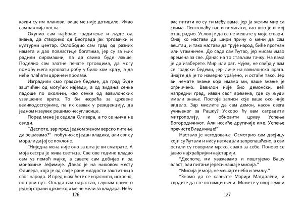 вас питати ко су ти међу вама , јер ја желим мир са свима . Поштоваћу вас и помагати , као што је и мој отац радио . Услов је да се не мешате у моје ствари . Онај ко настави да шири причу о мени да сам вештац , и тако настави да трује народ , биће прогнан или утамничен . До сада сам ћутао , јер нисам имао времена за све . Данас на то стављам тачку . На вама је да изаберете . Мир или рат . Чујем , не свиђају вам се градски бедеми , јер личе на вавилонска врата . Знајте да је то намерно урађено , и остаће тако . Јер ви немате знање која имамо ми , ваше знање је огрничено . Вавилон није био демонски , већ напредни град , изван свог времена , где су људи имали знање . Постоје записи које ваше око није видело . Зар мислите да сам демон , након свега учињеног за Рашку ? Ускоро ћу вам саградити митрополију , и обновити цркву Успења Богородичиног . Али носиће другачије име . Успење пречисте Владичице !“
