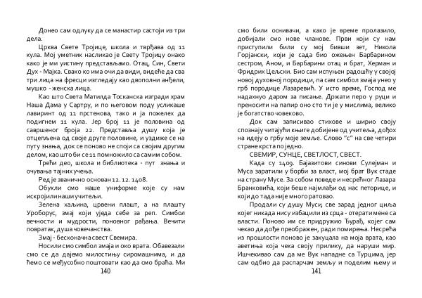 Док сам записивао стихове и ширио своју спознају читајући књиге добијене од учитеља , дођох на идеју о грбу моје земље . Слово ’’ с ’’ на све четири стране крста по једно . СВЕМИР , СУНЦЕ , СВЕТЛОСТ , СВЕСТ . Када су 1409 . Бајазитови синови Сулејман и Муса заратили у борби за власт , мој брат Вук стаде на страну Мусе . За собом поведе и несрећног Лазара Бранковића , који беше најмлађи од нас петорице , и који до тада није много ратовао .