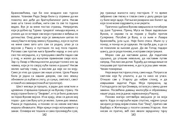Шест месеци је прошло , а један део властеле и црквених старешина прешао је на Вукову страну . На мојој страни били су ’’ Змајеви “, и то је било довољно за пораз Вукове војске . И на крају , ипак се десио мој пораз - дао сам Вуку што је желео . Јужни део земље . Рашка је подељена , а поново се на неким местима морала обнављати . Моји крици очаја испуњавали су замак . Оливера ме тешила и сама проливајући сузе , 142