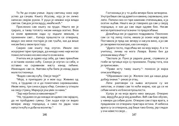 Учитељ ме је одвео код себе , да тамо преноћим и останем колико хоћу . Скинуо је огртач са себе , и оставио на скривеном месту изнад пећине . Изненадио сам се . Његова кућа била је изнад једне мале гостионице . ’’ Видео сам ову кућу . Ово је твоје ?“ ’’ Моје , а припадало је и мом оцу . Живимо од тога , а трудимо се и да помогнемо сиромашнима . Имам жену , три сина и једну кћер . Синови су отишли на своју страну , Марија је још увек са нама .“ ’’ Зар није била са нама вечерас ?’’ ’’ Не , трудимо се да никада не идемо сви заједно , да не пробудимо сумњу . Сви људи које си видео вечерас имају породице , а само по један члан напусти кућу и дође на молитву .“