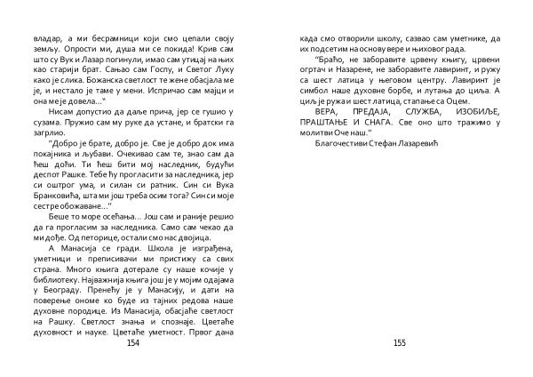 А Манасија се гради . Школа је изграђена , уметници и преписивачи ми пристижу са свих страна . Много књига дотерале су наше кочије у библиотеку . Најважнија књига још је у мојим одајама у Београду . Пренећу је у Манасију , и дати на поверење ономе ко буде из тајних редова наше духовне породице . Из Манасија , обасјаће светлост на Рашку . Светлост знања и спознаје . Цветаће духовност и науке . Цветаће уметност . Првог дана 154