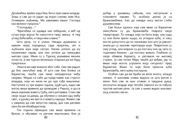 Све бољи односи које сам имао са Бајазитом омогућили су да Бранковићи поврате своје терирторије . То никада није ни било моје , али сада су они били зрели људи , из угледне куће , и нису могли допустити да их понижава оно што је јавност знала-да су њихове територије моје . Повратили су свој углед , али морали су да постану оно од чега су годинама бежали - да постану вазали . Плаћали су своје обавезе Бајазиту , и ратовали на његовој страни . Ја сам почео Мару чешће да виђам , јер то више није могло угрозити моју сигурност пред Бајазитом . Више то није била пркосна кућа Бранковића , него њему послушна .